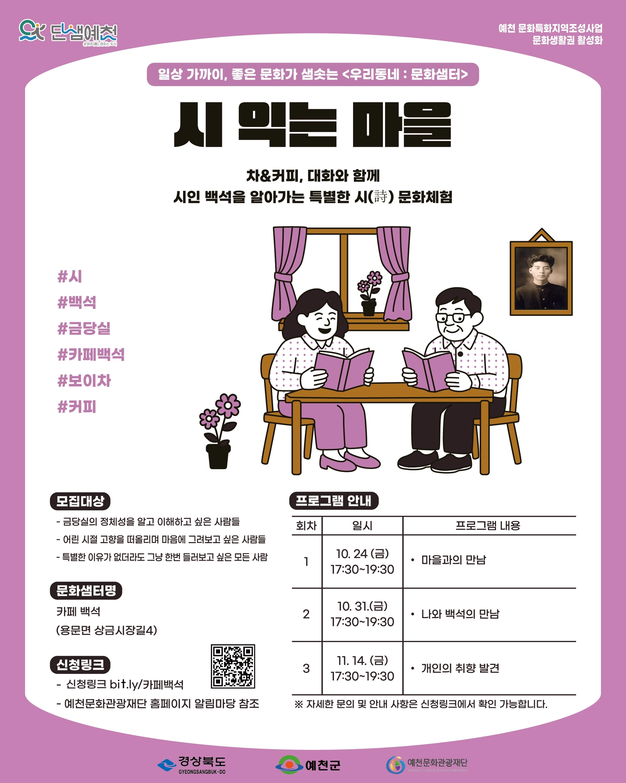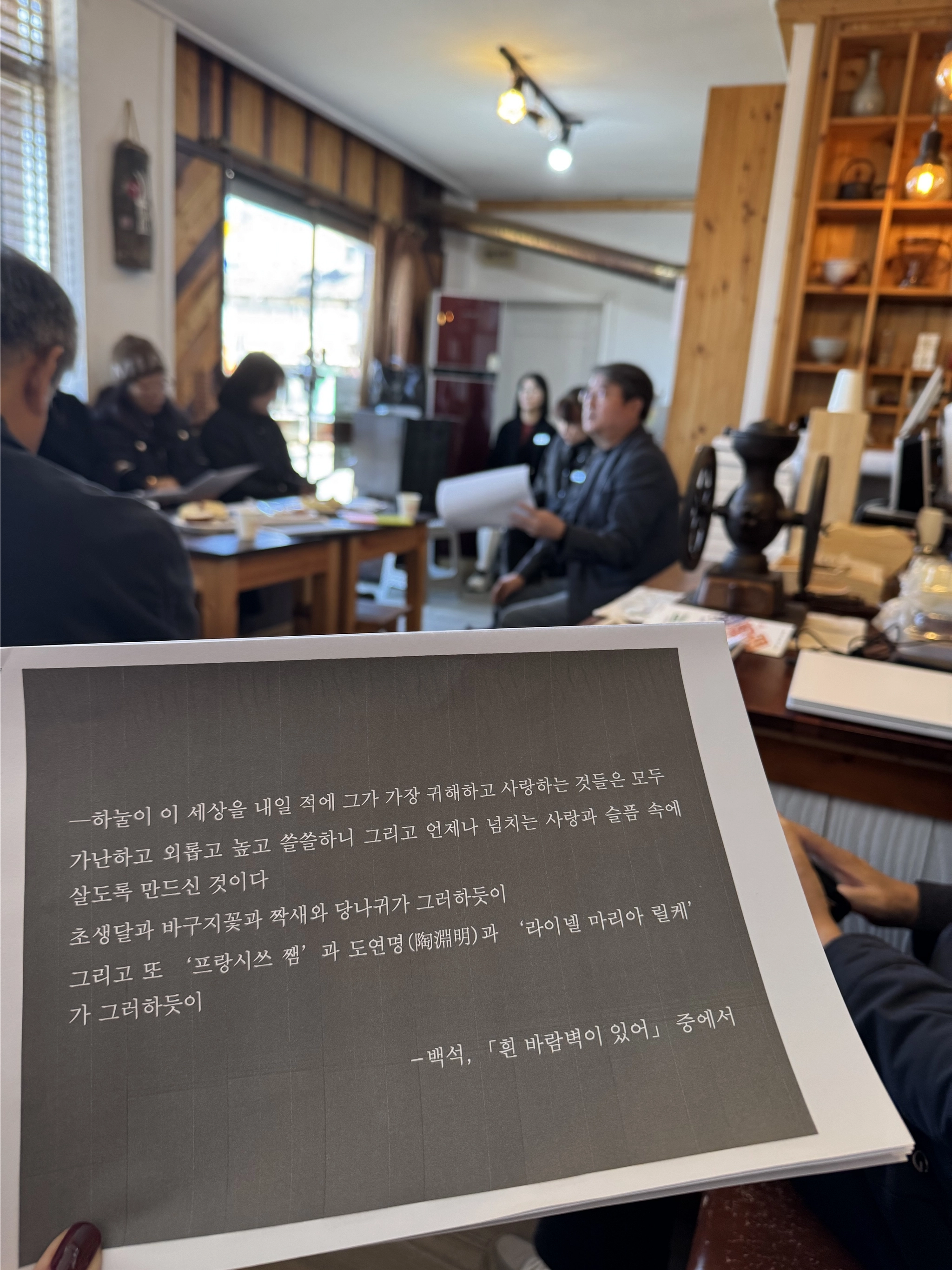 카페 백석에서는 금당실이 품은 자연적·문화적·인문학적 환경을 매개로, 잊고 지냈던 나의 감성을 시를 통해 깨우는 시간을 마련합니다. 이 공간에서는 차 한 잔의 여유 속에서 삶에 위로와 쉼을 얻고, 고향과 가족, 이웃과의 동행을 다시금 떠올릴 수 있는 곳입니다.